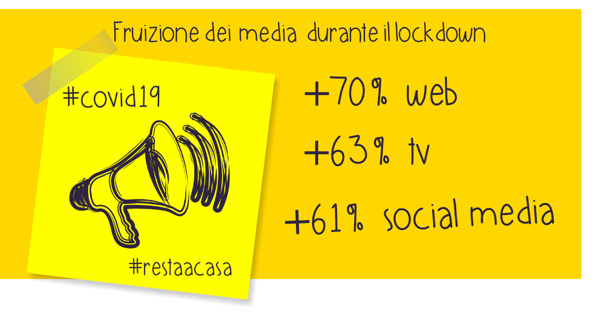 - stando a casa è aumentata significativamente la fruizione dei media, in particolare della navigazione web (+70%), della tradizionale TV (+63%) e infine dei social media (+61%);